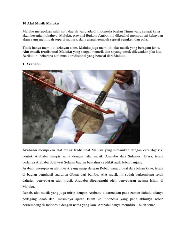 Inilah 10 Daftar Lengkap Alat Musik Maluku Yang Unik Hanyaberbagi from hanyaberbagi.com Arababu adalah salah satu alat musik tradisional asal maluku, bentuknya hampir mirip dengan arababu yang ada di sulawesi utara namun bagian bawahnya sedikit lebih panjang. Hal ini karena awalnya arababu berkembang di maluku sejak perdagangan arab. Cara memainkan alat musik arababu ini yaitu dengan cara digesek memakai alat khusus yang terbuat dari bambu dan juga dawai yang dibuat dari bahan serat pisang hote. Menurut sejarahnya, alat musik arababu berkembang pada pulau maluku stelah peagang arab yang datang untuk berdagang di indonesia. Alat musik tradisional maluku adalah arababu, alat musik gesek berbentuk panjang. Arababu adalah alat musik dari sulawesi utara yang memiliki kemiripan bentuk dengan alat musik rebab. Arababu adalah alat musik tradisioal maluku yang dimainkan lewat cara digesek. Arababu merupakan alat musik yang mirip dengan rebab yang dibuat dari bahan kayu, tetapi di bagian penghasil suaranya dibuat dari bambu.
