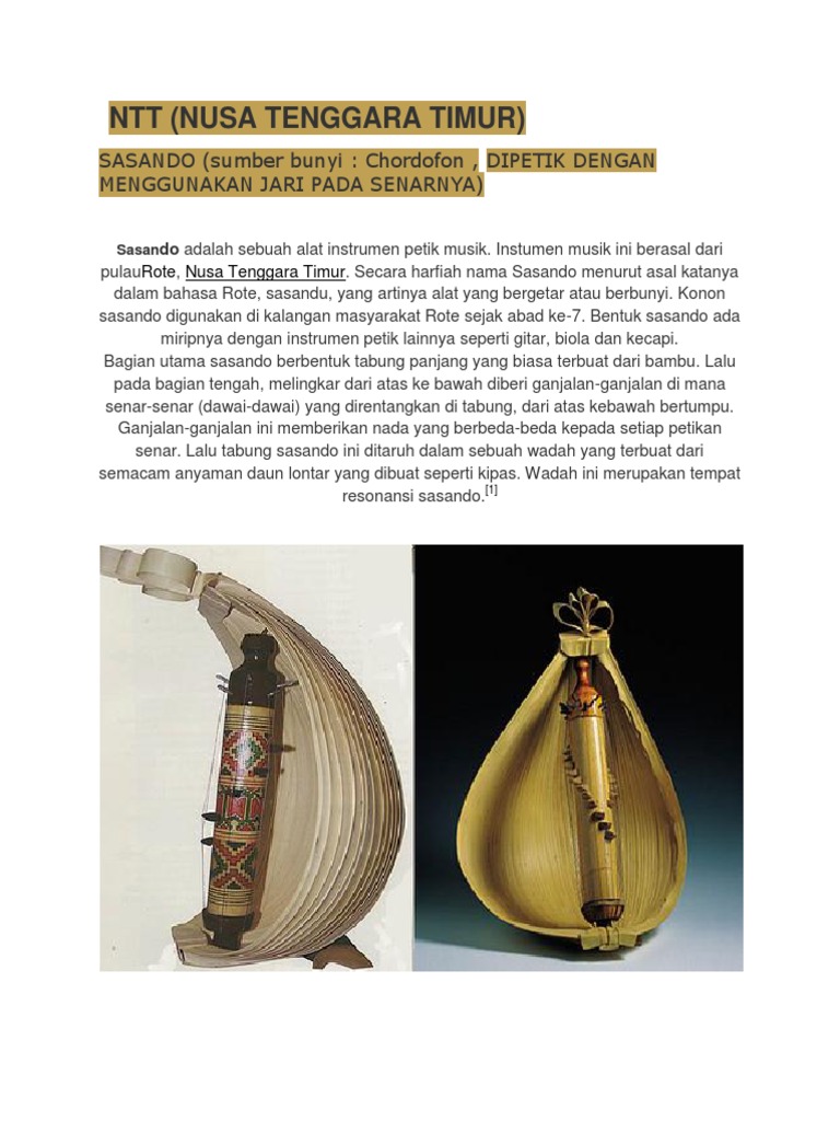 Bentuk alat musik tradisional sasando bentuk alat musik sasando mirip dengan alat musik petik lainnya seperti gitar, biola, dan kecapi. Alat musik sasando adalah alat musik berdawai yang menghasilkan suara dengan cara dipetik. Sasando sudah terkenal dan mendunia utamanya ketika diselenggarakan konser wow tahun 2013 yang digelar wonderfull indonesia. Berasal dari pulau rote nusa tenggara timur (ntt). Alat musik tradisional ketiga dalam daftar ini yang terkenal. Dalam suatu legenda, sejarah alat musik sasando mempunyai banyak versi tentang bagaimana kemunculan alat musik sasando. Sasando memiliki bentuk utama yaitu tabung panjang yang dibuat dari bahan bamboo. Instrumen yang termasuk dalam bentuk tabung misalnya calung, angklung, kentongan/kulkul, suling/saluang, dan guntung. Cara memainkan alat musik sasando cara memainkan alat musik sasando adalah dengan dipetik, bagian yang dipetik adalah dawainya yang direntangkan di tabung. Kini musik sasando dikenal sebagai alat musik yang menghasilkan melodi terindah dari pulau rote. Bentuk alat musik sasando mirip dengan alat musik petik lainnya seperti gitar, biola, dan kecapi. Alat musik sasando sama seperti alat musik petik lainnya seperti harpa, gitar, kecapi, dan biola. Bentuk dan bahan bentuk alat musik tradisional sasando ada kemiripan dengan alat musik petik lainnya seperti gitar, biola dan kecapi.